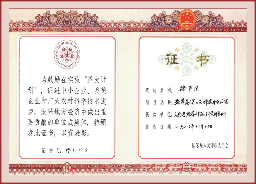 授奖级别 国家星火奖科技奖四等奖(1988年获云南省星火科技奖二等奖)