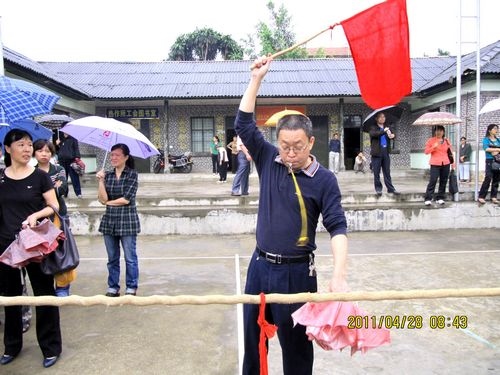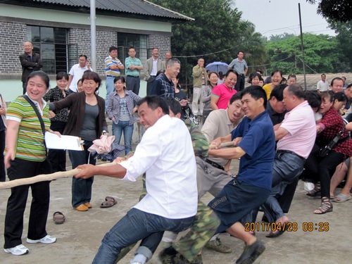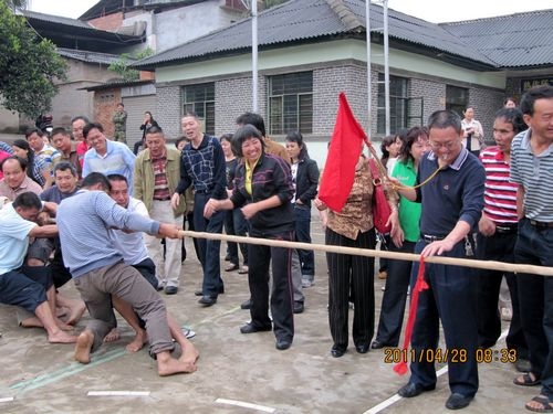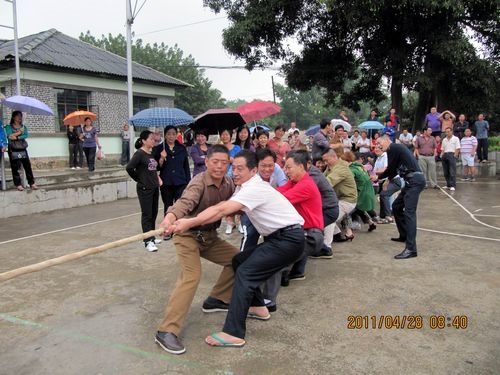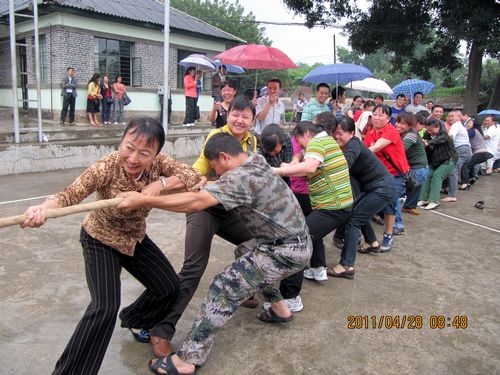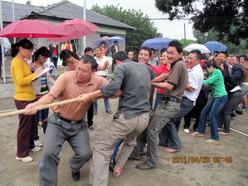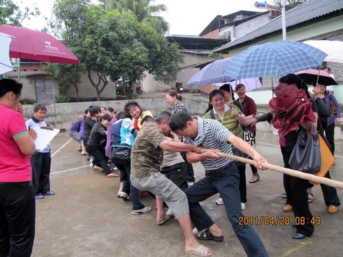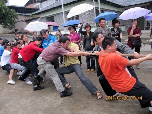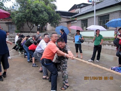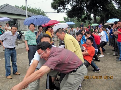 天公不作美,拔河比赛才进行了三场,就开始下起了小雨,但同志们的热情丝毫没有减弱,上场的队员都积极准备着拔河的站姿,重心下压,双腿微屈,身体后倾,双手握紧绳子,蓄势待发。工会主席李存生一声令下,两边的队员们拼命地、死死地拽紧拔河绳,用尽全身的力气,你争我夺。拔河绳一会儿摆过右边,一会儿又摆过左边,弱的一边,或由于地板潮湿最后被强的一边“稀里哗啦”拽过去了。没有上场职工们,撑着雨伞不停地为队友们呐喊助威。同志们冒着小雨一直把比赛进行到最后,参加拔河比赛的同志们头发衣服都淋湿了,胳膊也没劲了、两腿也发软了,但是留下的是一片欢声笑语。