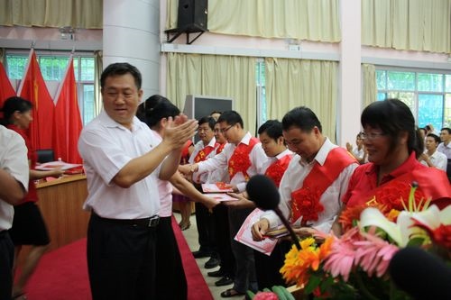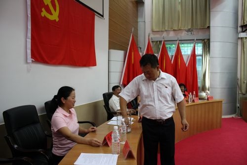 会场上熠熠党徽悬挂在主席台中央,鲜艳的红旗分列两侧,格外庄重醒目。来自各科室的优秀共产党员和优秀党务工作者披红挂彩就座于会场的最前方。