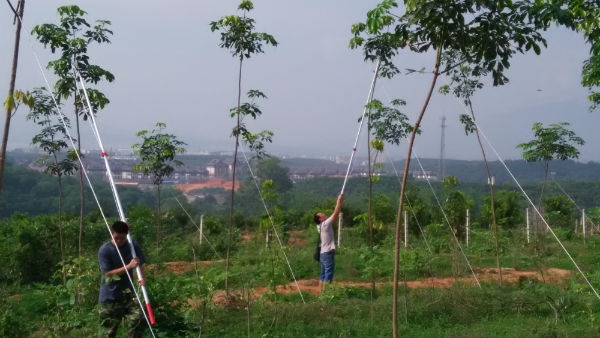 2015年6月1日 开始,在江南队洪支荣队长的带领下,全队技术员、辅导员以及两名巡防人员共计七人,全面展开全队幼林修枝整形工作。橡胶树幼树的修枝整形工作,是保证橡胶树树冠整齐优美、茎干平直光滑、径围稳定增粗的必要措施之一。修枝整形工作是一项常年性工作,看似简单却十分重要。因此,洪支荣队长决定亲自率队为幼林进行修枝整形。
