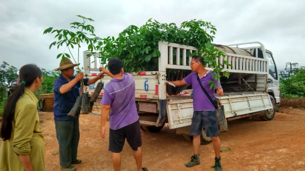 2015年6月26日 ,在清点好补换株数、准备好苗木、挖好穴坑后,在江南队洪支荣队长的带领下,副队长刘冰洋、技术员熊延林以及各岗位管理工人共同配合,一上午时间便将124株补换株全部更换完毕。由于27、28日两天,降雨量稀少。为保证补换植苗木成活率,29日下午、30日上午,洪支荣队长还及时安排相关人员进行浇水作业。由于补换株之间距离较远,而山路崎岖无法进行机器作业,只能人挑桶浇,因此需要大家的齐心协力才能尽快地完成浇水工作。29日下午,大家一鼓作气,完成了山顶的107株补换株浇水工作,不知不觉都已七点,可是没有一个人有一声抱怨。因为,唯有踏踏实实、勤勤恳恳地干事,才能将橡胶树幼林管理工作做好,才能真正将生态胶园给管理好。30日上午,大家赶早上山,将山腰余下的17株补换株迅速浇灌完毕,力争在烈日当空之前能让胶苗喝上生命之水,保证补换株的成活率。