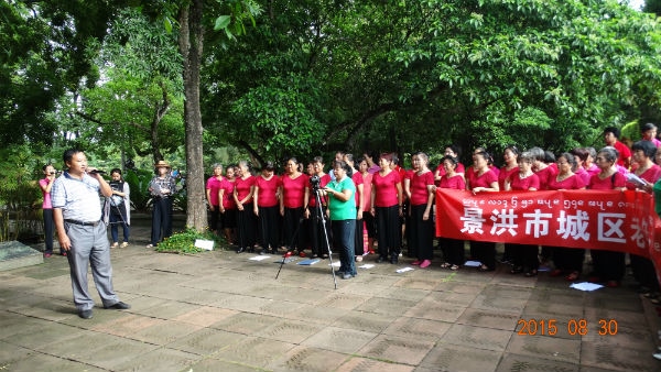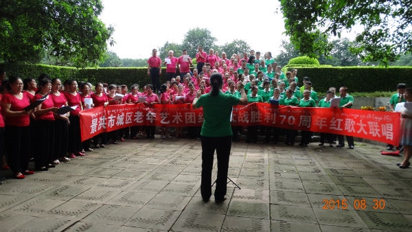 9月3日 ,是中国人民抗日战争胜利70周年纪念日,为缅怀抗日先烈,庆祝中华民族反抗日本帝国主义侵略战争的伟大胜利,由孔雀湖社区合唱艺术团发起,花卉园、新城、沧江,曼听公园等社区艺术团积极响应, 8月31日 ,5个老年艺术团汇聚花卉园油棕林,高唱红歌,隆重纪念中国人民抗日战争胜利70周年。