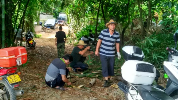 10月9日 上午,洪支荣队长带领全队技术员、辅导员以及巡防人员共9人,来到生态胶园林地旁。刚到目的地,大家便立即展开工作。有的就地取材,砍竹子削竹片;有的将绑绳分成等长小段,以便捆绑扶苗;有的拿上削好的竹片和绑绳,一带带、一株株地将倒伏的胶苗固定扶正。大家分工明确、密切合作,仅仅一上午,便固定扶正了倒伏苗约400余株,在扶苗的过程中还顺带对部分橡胶幼苗进行了抹芽。