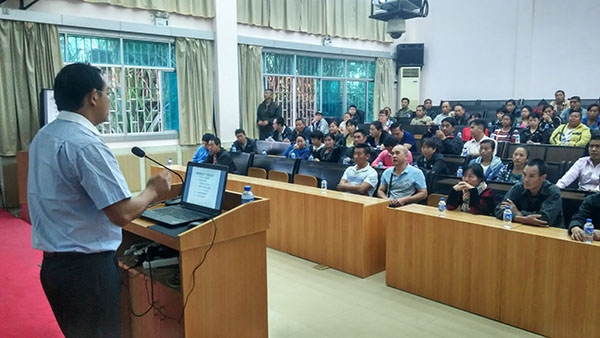 省热作所试验推广办副主任何海宁在进行理论知识培训