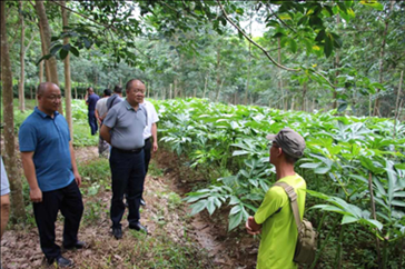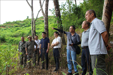 8月11日上午,检查组一行来到勐捧农场一分场5队橡胶园和六分场3队橡胶林下魔芋种植试验地,检查农场胶园更新改造进展和生态胶园林下种植示范情况。