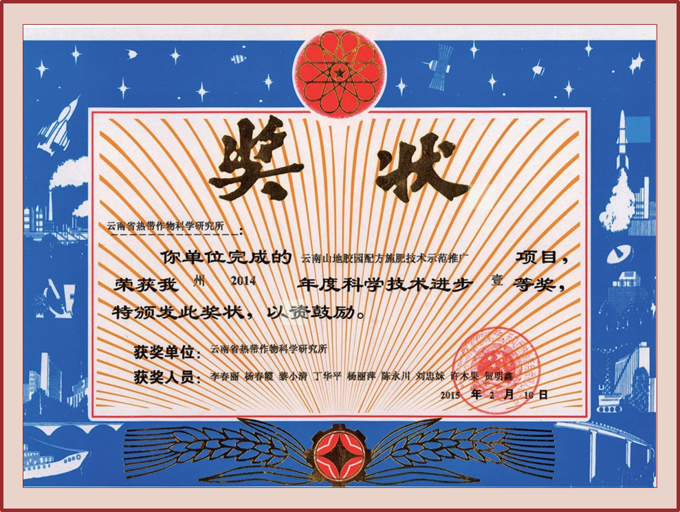 成果简介 该项目立足于云南山地胶园特殊的气候条件、复杂的地形地貌、丰富的土壤类型,在云南植胶区大规模推广乙烯利刺激割胶以后,首次对西双版纳、普洱、红河、临沧等4个主要植胶区不同的土壤类型、立地条件、营养管理水平的128万亩开割胶园土壤和橡胶树营养状况进行系统、全面的普查,摸清了云南山地胶园土壤和橡胶树营养状况。