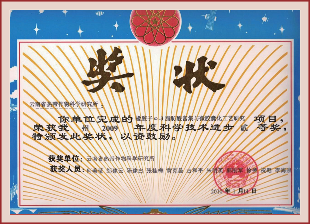 成果简介 橡胶种子是云南天然橡胶产业的副产物,优质橡胶籽原油中含有80%以上的不饱和脂肪酸,是一种集天然、安全、营养、有功能性、可再生的天然木本植物油源,虽然其食用安全性及医用功效的研究成果确切,但具功能作用的ω-3脂肪酸因对贮存环境中的光、热、氧等因子敏感极易哈败变质而难于开发利用,通过微胶囊化工艺可很好地解决这一问题。