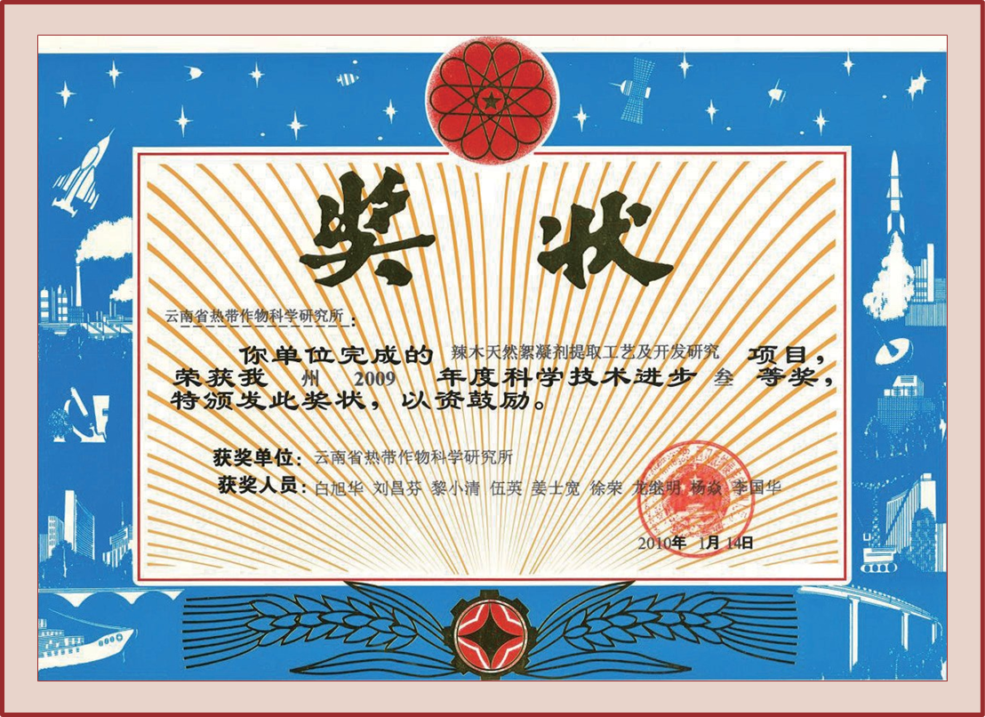成果简介 项目首次在国内采用超临界CO2流体萃取辣木籽油,确定了超临界CO2流体萃取辣木籽油的最佳工艺参数,提出了辣木天然絮凝剂提取及纯化工艺;确定了提取辣木天然絮凝剂的最佳品种;试制出辣木天然絮凝剂产品剂型2个,产品的絮凝率>90%;澜沧江水用辣木天然絮凝剂处理后,其浑浊度、嗅味、肉眼可见物、pH值等指标达到《生活饮用水标准》(GB 5749—2006);辣木天然絮凝剂用于啤酒澄清和城市污水絮凝效果的悬浮物,去除率分别为92.91%和93.38%。