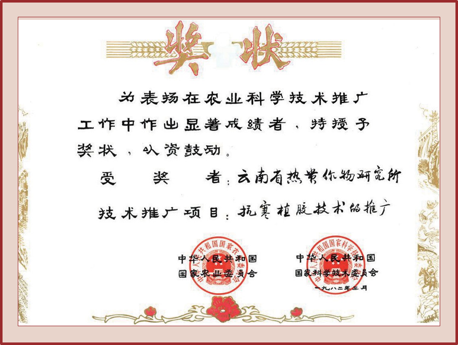 成果简介 云南垦区地处热带北缘,海拔较高,冬季热量不足,常使胶树遭受不同程度寒害。通过历次寒害调查,特别是1973—1974年、1975—1976年冬的寒害调查和多年试验研究,总结出在云南垦区抗寒植胶的综合技术措施:正确选地进行小区区划是基础,按小区配置对口品系是关键,因地制宜采取有效的抗寒栽培措施是保证,并制订了实施细则。1977年以来,在全省6个植胶区推广应用,取得了明显的效果。