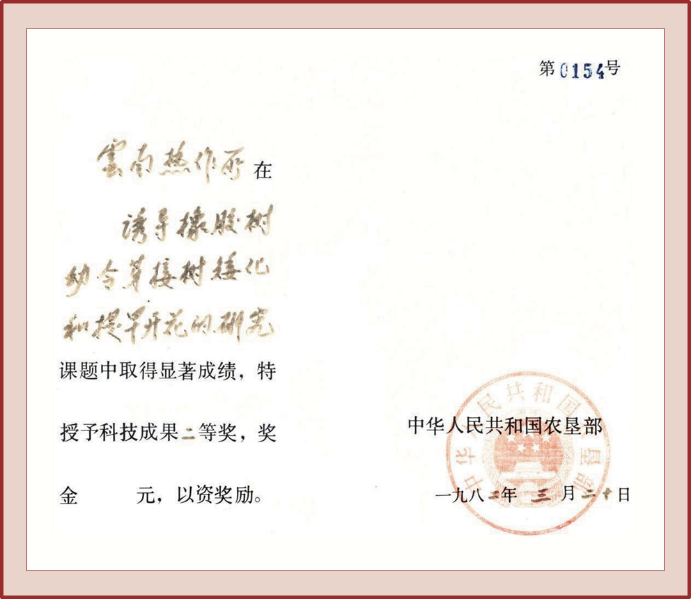 成果简介 橡胶树是高大乔木,开花树龄因品种和立地环境而异,一般要4~5龄才开始开花,此时树高已达7~8 m。诱导幼龄芽接树矮化并提早开花可方便人工授粉,提早使用有价值的无性系作杂交亲本,对加速橡胶树育种进程和节省授粉费用均很有价值。一些植胶国家亦开展这方面的研究,尤其是诱导早花的研究,例如用光周期、弯茎、冠接、环状剥皮和施用化学药剂诱导等,但均未应用于实际的橡胶杂交育种工作。本项目在国外研究的基础上,通过1975—1980年连续5年对1~1.5龄的34个无性系作不同诱导方法处理,取得了良好效果。