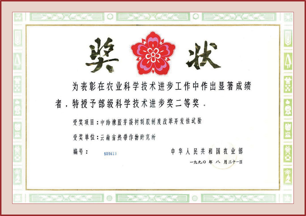 成果简介 由广东农垦总局牵头,与华南热作研究院橡胶研究所等10家单位共同承担国家经济贸易委员会批准农业部下达的国家重点开发项目“中龄橡胶芽接树割胶制度改革开发性试验”。根据云南垦区的具体情况,采用适合于本地区的刺激割胶新制度,3年试验结果, ‘PR107’比常规割胶增产24.9%,‘PB86’增产23.3%,‘GT1’增产10.2%。刀次减少20.1%,耗皮减少20%,1988—1990年,云南农垦应用此成果推广484.6 hm2,增加产值1 012.9万元,增加税金55.83万元。