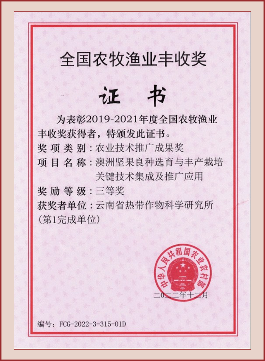 选育并推广澳洲坚果良种5个。选育品种具早结、丰产、优质、抗性强等特点,已在云南省推广种植200余万亩,约占全省澳洲坚果总种植面积的50.4%;营建‘O.C’‘A4’‘A16’‘桂热1号’和 ‘HAES863’良种采穗圃8个,面积1 850.4亩,生产良种优质穗条 381.4万条,良种覆盖率达80%以上;集成创新了1套云南山地澳洲坚果栽培关键技术,包括授粉品种配置、肥水调控、病虫害防控、高效采收等技术,首次制定出国内澳洲坚果丰产树叶片营养推荐指标、国内首创澳洲坚果乙烯利促落果高效采收技术。实现10年生示范基地亩产鲜壳果达225.7 kg,比对照提高34.7%。采用“科研院所+示范基地+农业推广站(公司)+种植户”的创新推广模式进行大力推广,澳洲坚果丰产栽培关键技术在全省示范推广累计达182.35万亩,新增壳果产量1.69万t,实现产值8.84亿元,新增利润3.38亿元。举办各类澳洲坚果栽培技术培训班718期,培训人员57 082人次,为全省澳洲坚果产业的良性发展提供了有力支撑。