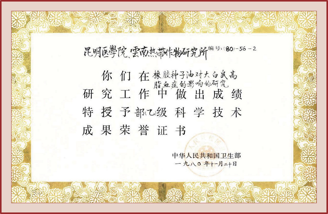 成果简介 近10年来,用多价不饱和脂肪代替饱和脂肪作为防治高脂血症和动脉粥样硬化、降低心脏病死亡率的一种主要方法,也是促使动脉粥样硬化病变消退的一种可能途径。橡胶种子油是一种富含不饱和脂肪酸,可供长期食用的植物油。1975—1976年,研究人员发现正常大白鼠长期食用橡胶种子油后,有血脂下降倾向,现场调查证明,长期食用橡胶种子油的人群中高脂血症的发病率明显低于同地区食用其他油脂者。用橡胶种子油治疗高脂血症也有良好疗效。
