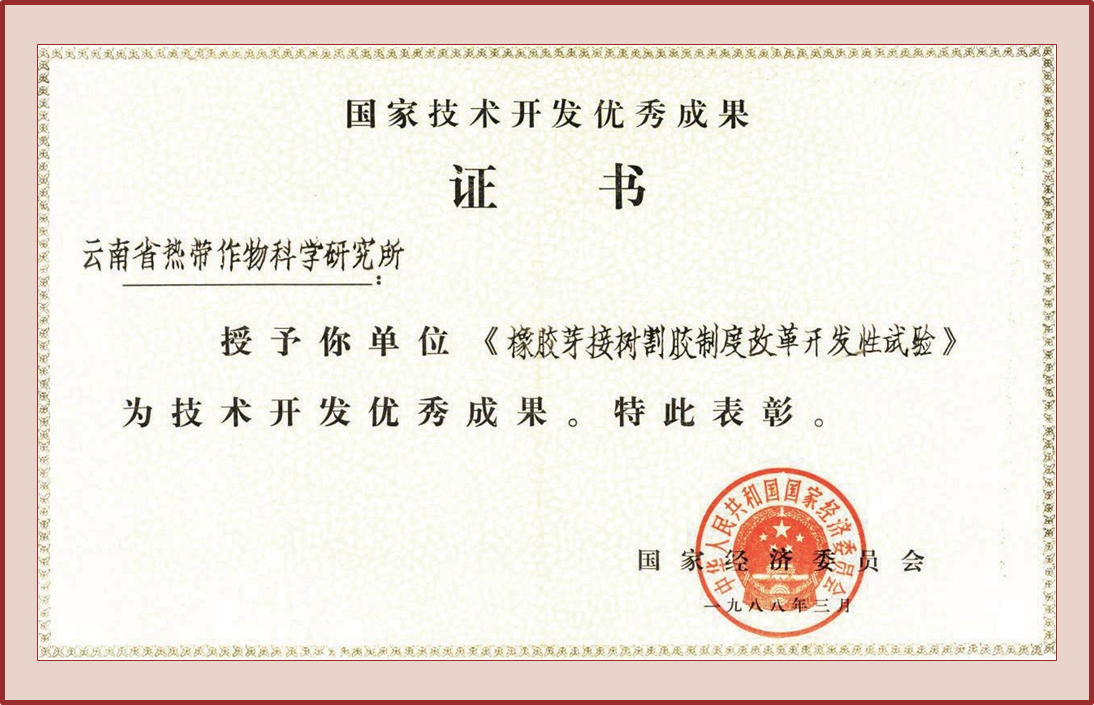 成果简介 该项目是在前期研究乙烯利刺激割胶的基础上,针对我国20世纪60年代和70年代初大量种植的‘PR107’‘GT1’和‘PB86’已进入中龄期,正处于刺激最佳时期,为了挖掘这些中龄芽接树的产胶潜力,由农业部农垦局组织有关单位共同协作开展的。该技术采用低频、短线、少药、浅割、轮换、增肥、动态分析等措施,按地区特点,推广5种新型刺激割胶制度,通过多因子综合调控,大多数刺激割胶制度在比对照减少28%~48%割次的情况下,干胶极显著高于对照,增产率达20%左右,单株年增产干胶0.6~0.8 kg,省皮20%~40%,省工30%,减少了胶树的割面病害,增加了胶工的收入,取得了显著的经济效益和社会效益。该技术具有我国特色,达到国际同类技术先进水平,适用于我国各植胶区,推广对象为15龄以上正常的橡胶芽接树 ‘PR107’‘GT1’和‘PB86’及其他耐刺激品系。