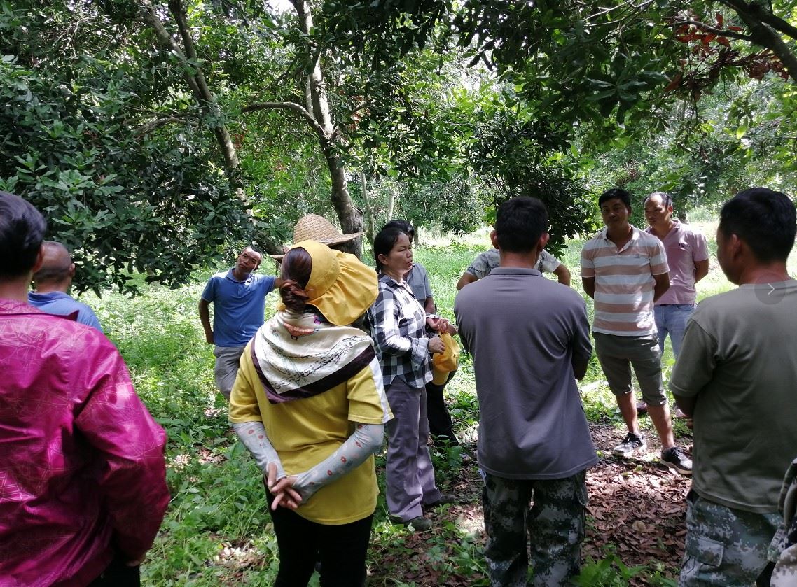 云南省热带作物科学研究所蒋桂芝高级农艺师对坚果病害进行现场讲授