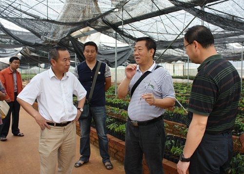每到一个实验点所长李国华和相关负责人都详细的向调研组一行介绍省热作所的科研工作情况:一是介绍农业部橡胶树优良品种籽苗繁殖基地的籽苗繁殖情况,介绍籽苗芽接中老态芽条橡胶苗和幼态微型芽条橡胶苗的区别,通过籽苗芽接方式培育的橡胶苗,具有产量高、出苗周期短的优势,且极大的提高了土地利用效率,节约了生产成本;二是介绍省热作所自2002年开始系统研究辣木以来的科研进展情况和中古辣木科技合作中心试验示范基地的辣木研发情况,介绍了辣木、诺丽种质资源收集与品种选育情况、栽培与病虫害防控技术、营养价值与功效等内容;三是介绍生态胶园的建设情况,生态胶园采用“片段化、斑块化、立体化”的种植模式,根据地形、坡度、海拔等因素作为种植区域划分的依据,科学合理的种植宜种的树种,在该模式下,70%左右的土地仍以种植高产、耐寒、耐旱的高品质橡胶树种,而30%左右的土地则用来种植珍贵树种,通过种植技术创新,探索出一条既能实现良好的经济效益,又能保护生态环境,保护生物多样性的新型橡胶种植模式;四是分别介绍橡胶和澳洲坚果的种质资源保存情况,目前,省热作所已收集保存野生橡胶树种质资源3300多份,澳洲坚果种质资源200多份,是培育橡胶、澳洲坚果新品种的基因库;五是介绍了省热作所澳洲坚果加工的特点和优势。六是介绍了红掌种质资源的收集与保存、新品种培育与保护、市场前景等情况;七是介绍了牛肝菌在菌种培养、菇房周年栽培、仿野生栽培技术等方面的研发情况。