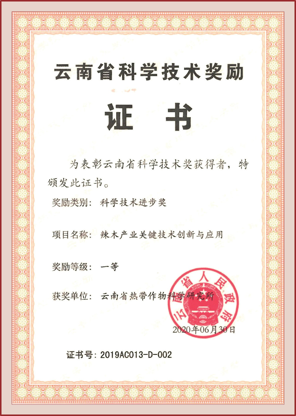 授奖级别 云南省科学技术进步奖一等奖