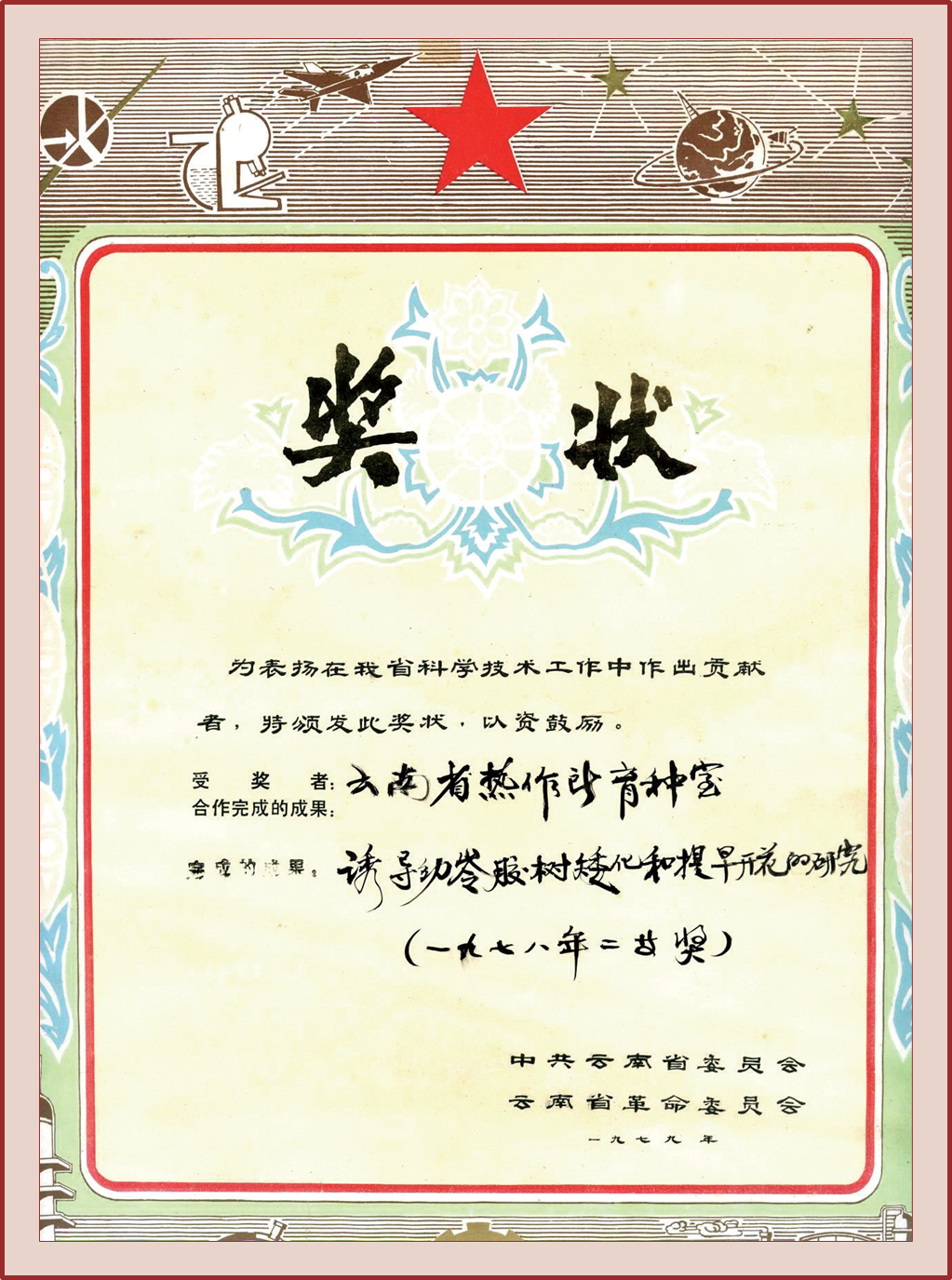 成果简介 橡胶树是高大乔木,开花树龄因品种和立地环境而异,一般4~5龄开始开花,此时树高已达7~8 m。诱导幼龄芽接树矮化并提早开花,可方便人工授粉,提早使用有价值的无性系作杂交亲本,对加速橡胶树育种进程和节省授粉费用均很有价值。一些植胶国家亦开展此方面的研究,尤其是诱导早花的研究,例如用光周期、弯茎、冠接、环状剥皮和施用化学药剂诱导等,但均未应用于实际的橡胶杂交育种工作。本项目在国外研究的基础上,通过1975—1978年对1~2.5龄的18个无性系作不同诱导方法处理,取得了良好效果。