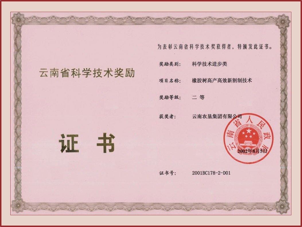 成果简介 “橡胶树高产高效新割制技术”是科学利用乙烯利对橡胶树的刺激增产作用机理,根据云南植胶区的独特自然条件,通过总结和系统分析20多年来乙烯利刺激割胶的试验研究成果,消化吸收国内外的割制改革经验而设计出来的。其主要内容为:改原来的S/2D/2常规割制为S/2D/3+ET、S/2D/4+ET中老林割制和(S/2+S/4↑)D/3+ET、(S/2+S/4↑)D/4+ET老龄割制,按不同品种、不同割龄段施用不同浓度的乙烯利刺激剂。新割制技术全面执行低剂量、低频率、减刀、浅割、增肥和产胶动态分析指导割胶的技术路线,把防病、营养诊断施肥、安装防雨帽和戴头灯早割等列为配套技术一起在全垦区大面积推广应用,通过1998—2000年实施,取得了极其显著的成效。一是干胶增产,收入增加。3年累计增产干胶18 642 t,增加产值1.53亿元。二是实现了减员增效。与1997年比,胶工减少35.2%,人均负担面积和株数分别增加62.1%和63.5%,人均产胶2000年达到3.85 t,增幅66.7%;劳动生产率提高60%以上。干胶生产成本逐年降低,至2000年比1997年下降1 487元/t,降幅26.6%。3年累计增收节支5.96亿元,新增利税7 027万元,取得了巨大的经济效益。三是通过推行新割制还提高了胶工队伍素质,增加了胶工收入;节省了树皮,减轻了死皮病害,延长了胶树的经济寿命。同时,通过3年推行新割制的实践,制定了适合云南植胶区自然环境、胶树产排胶特点和品种特性的《云南农垦橡胶树新割制技术规程》,为垦区今后实施新割制提供了技术保证,对推动云南全省(农垦和民营)天然橡胶产业的发展将产生重要的作用。