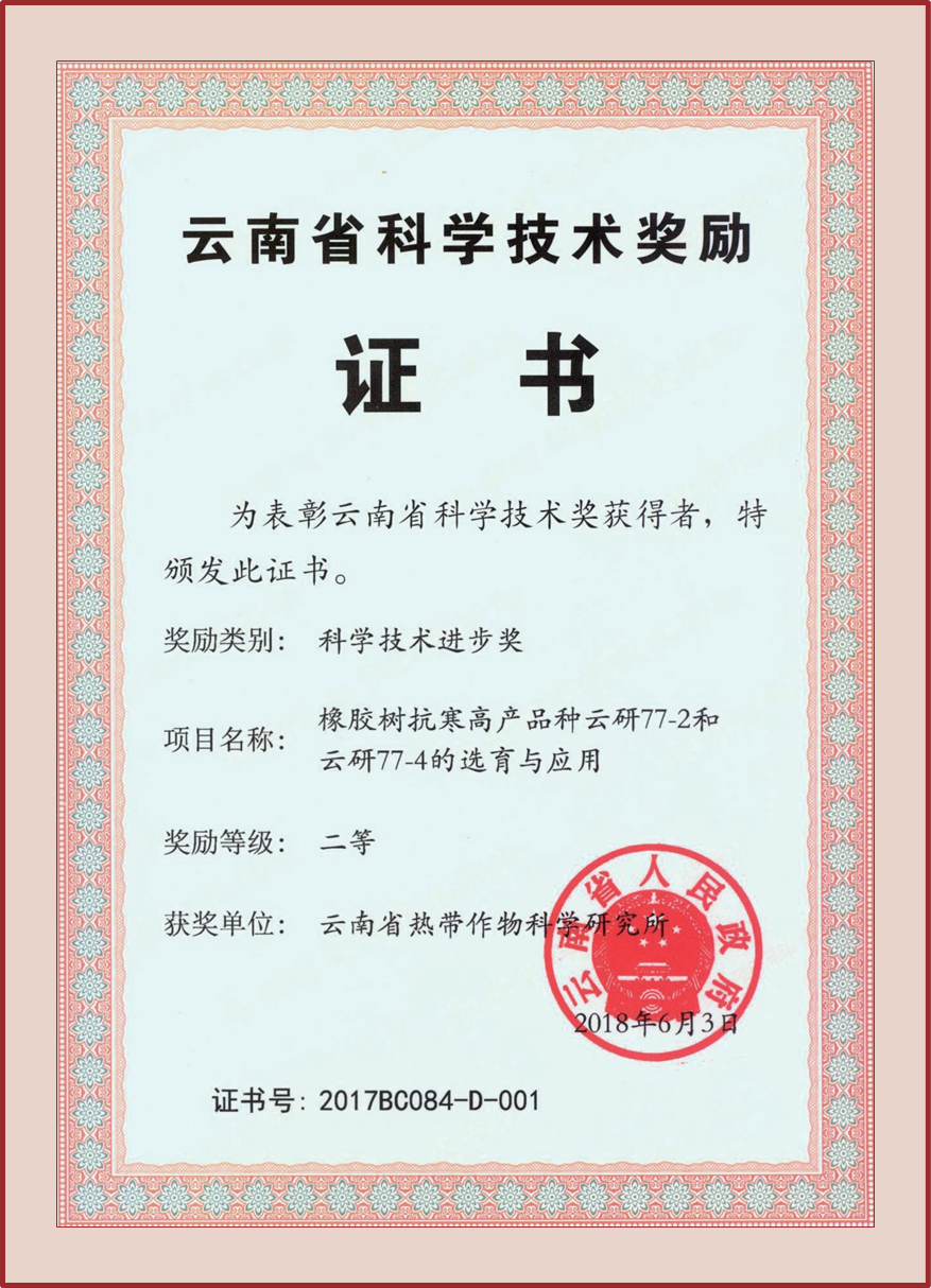 成果简介 由于云南植胶区纬度偏北、海拔高、冬季热量不足,有些年份会出现低温寒害,寒害是云南省发展天然橡胶产业的主要限制因素。‘云研77-2’和‘云研77-4’是云南省热带作物科学研究所通过科技攻关选育的具有抗寒、高产、速生特性的三倍体橡胶树新品种,其主要特点如下。