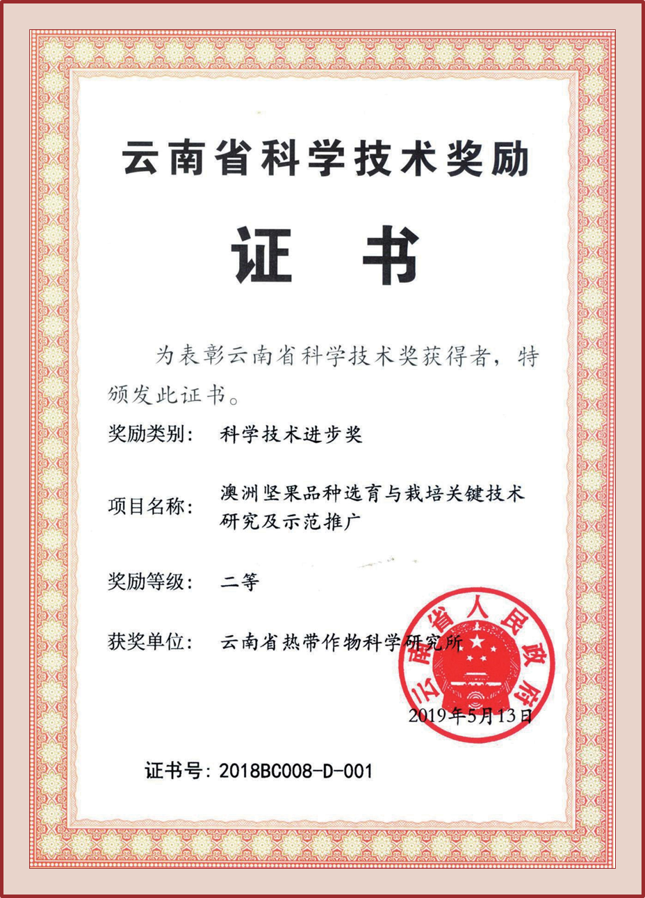 经多年对50个引进品种进行区域性与生产性试验,筛选出适宜云南推广的审(认)定良种3个(其中,2个被农业农村部遴选为全国主导品种),产量、品质与原产地相当。据2013—2017年对云南5个澳洲坚果主要种植区(临沧、德宏、保山、普洱和西双版纳)的调查统计,筛选出的3个良种在现有果园中的占比达58%以上。