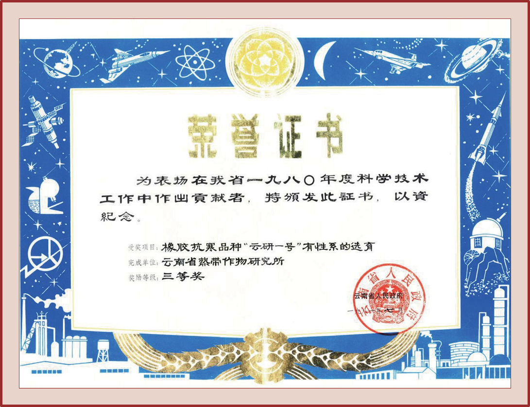 成果简介 ‘云研一号’有性系是1966年以无性系‘GT1’和 ‘PR107’杂交的有性后代。在1973—1974年、1975—1976年冬两次特大低温中,因抗寒表现突出而被选出。现生产上已种植2万余亩。
