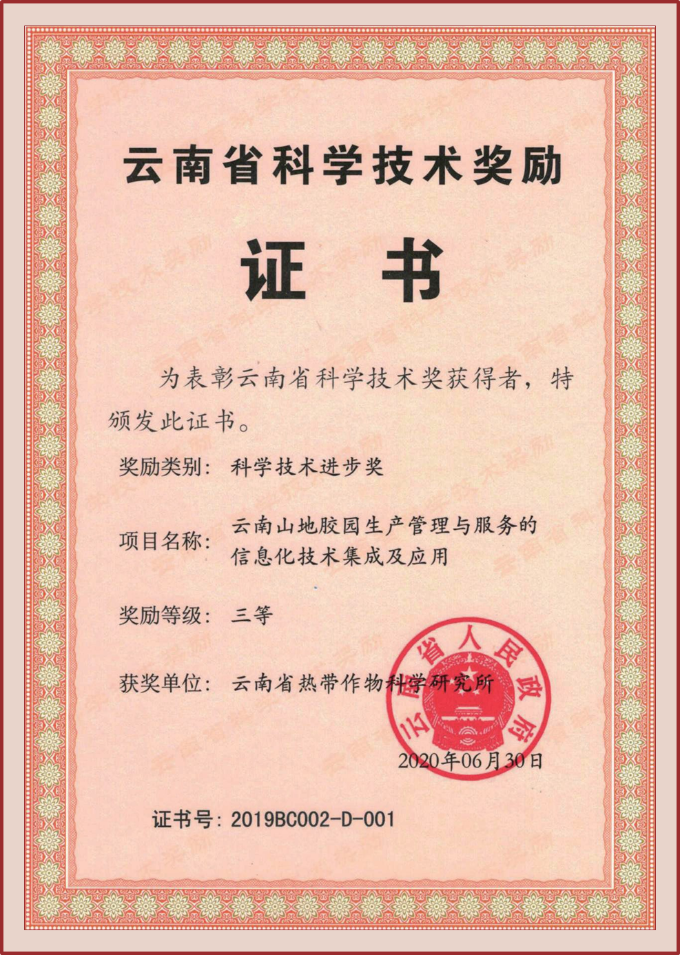 该项目获得计算机软件著作权5项,出版专著1部,发表学术论文9篇,获得授权实用新型专利2件;项目成果在2017—2018年累计推广应用113.2万亩,增产干胶4 798 t,干胶按1.2万元/t计,新增产值5 757.6万元,经济、社会效益显著,实现了橡胶树生产的高产高效,促进了天然橡胶产业的可持续发展,为云南热区边疆稳定、农民增收、企业增效等方面作出了重要贡献。