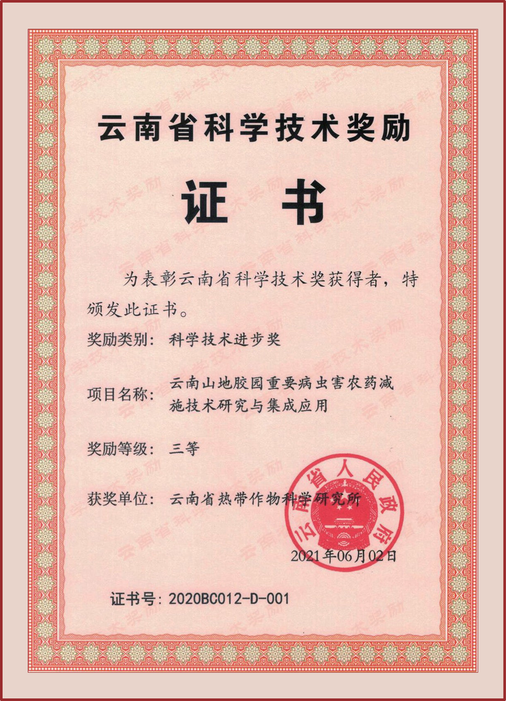 成果简介 天然橡胶是关系国计民生的基础产业,也是重要的战略物资,广泛用于航天、汽车、飞机轮胎和医疗卫生等领域;随着经济和社会的发展,我国天然橡胶需求量正逐年快速增长;云南已成为中国种植面积最大、产胶最多、单产最高的优质天然橡胶生产基地,天然橡胶产业已成为云南农业的特色和优势产业。在橡胶树病虫害多发重发频发的严峻形势下,农药对病虫害防治作出了重要贡献,然而,过量和不能合理、适时、对症用药,农药利用率不高,带来了农药残留毒性、病虫抗(耐)药性上升、次要病虫害大发生、环境污染和生态平衡破坏等一系列问题,严重威胁着云南省植胶生态环境安全;因此,迫切需要加快改变对农药过分依赖的传统技术方式。项目依托农业农村部南亚热作专项、云南省财政项目、云南省应用基础研究计划面上项目、云南省应用基础研究计划青年项目及云南农垦科技计划等项目;在稳产增产前提下,大力发展农药替代技术及相关产品研发,促进传统化学防治向现代绿色防控的转变,减少生产中化学农药的投入使用,实现农业生态环境保护相协调的可持续发展,促进胶农节本增效。主要内容及创新点如下。