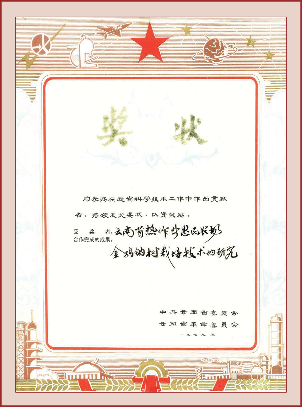 成果简介 金鸡钠树为茜草科(Rubiactae)金鸡钠属(Cinchona)植物,树的干皮、枝皮和根皮可提取奎宁,是一种重要的药用植物。 1968年,云南建立惠民农场,进行大面积生产栽培,为此进行了育苗技术研究,及时为生产提供大量种苗。同时,还进行了小苗芽接试验,选取含霜量高的母树采芽条,繁殖了大批芽接苗上山定植。