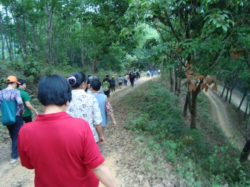 为丰富退休人员的晚年生活,吸引更多的退休人员参加健康有益的户外活动,帮助他们摆脱退休后的孤独、寂寞。继门球、地掷球、气排球、文艺协会之后,所退管办、老体协近日又新成立了老年登山协会,得到了大家的热烈响应。并于 3月26日 组织了第一次登山活动。74名退休人员7:40分准时从机关篮球场出发,在“省热作所老年登山协会”旗帜的引导下,大家兴高采烈地沿着老五队到达景洪农场二分场二队橡胶林开始登山,直到景洪电站大坝山顶。原计划从原路返回,但很多老同志说未近距离见过水电站,于是,只有4人因身体稍有不适从原路返回、来回 14公里 外,其余70人沿水电站——运输公司——砖瓦厂路线返回,来回近 20公里 。到家早的11点钟,最晚一批12点钟安全到家。