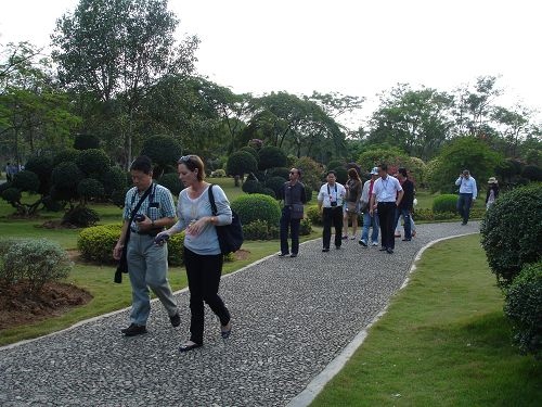 11月25日下午15时,在州旅游局的领导陪同下,与会人员50多名代表来到国家4A级旅游景区花卉园参观考察,参会成员分别来自老挝、越南、泰国、柬埔寨、缅甸五国旅游部门、中国国家旅游局、云南省和广西区以及相关国际组织。花卉园领导也参与陪同,并安排2名英语导游、2名泰语导游负责讲解,重点参观了周总理纪念碑、稀树草坪区、叶子花园、科技陈列馆、百果园、割胶表演等景点。