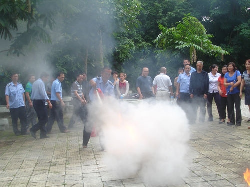 随后,在花卉园内科研楼后边的橡胶林地进行消防灭火演练,花卉园保安部杨成师经理详细讲解灭火器的使用方法及注意事项。在大铝盆内装上水并加上柴油,用火把点燃,用灭火器示范灭火。各部门员工10人参加练习灭火器的使用。