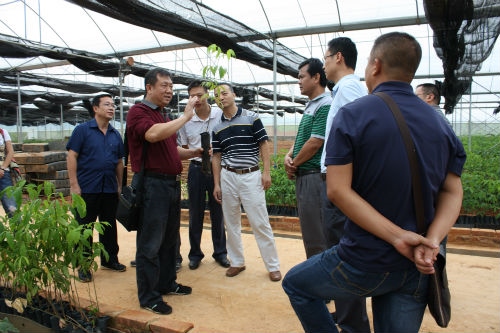 考察组一行首先来到省热作所橡胶籽苗芽接基地进行参观考察。所长和技术人员孙小龙向考察组介绍了有关橡胶籽苗芽接的技术、新品种的研发培育及产量等内容,芽接技术主要包括:增殖圃的老态芽条技术和组织培养的幼态微型芽条技术两种,主要介绍了云研77-2、77-4、77-525等新品种。并介绍了用于橡胶种苗定植的“围洞栽培技术”,此技术的优点在于其具有良好的保肥固水作用,能保证橡胶幼苗种植后2个月的水肥所需,对橡胶早期定根生长具有决定性的作用,同时也很好的解决了因干旱对橡胶幼苗栽培带来的影响。