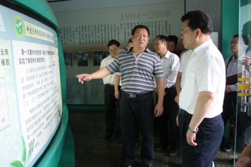 调研组一行首先来到花卉园第一代芽接橡胶树遗址进行参观,参观过程中云南农垦集团公司副总经理李民向副省长刘慧晏一行介绍了橡胶生产加工工业、天然橡胶与合成橡胶的区别和主要用途及橡胶的市场价格等内容。接着,所长李国华向调研组介绍了芽接橡胶树的历史及橡胶的割胶技术。随后,调研组来到科技陈列馆参观,科技陈列馆里的照片和文字记录的既是省热作所的发展史,也是一部橡胶发展史。在陈列馆,所长向调研组介绍了省热作所在橡胶领域取得的四次突破性成就、具有自主知识产权的“云研77-2”,云研“77-4”两个高产品种、橡胶树的木材加工综合利用及橡胶子榨油等方面的内容。副省长刘慧晏在看到陈列馆的所有资料都是2008年建设的时,当即提出给省热作所一定的经费更新陈列馆里的资料,他要求要把2008年以后所取得的科技成就添加到陈列馆中,以丰富陈列馆的内容。