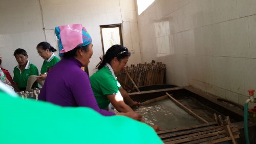 傣族最早的书写纸是棕榈树叶加工而成的,书写不是很方便。约在800多年前,傣族开始用构树皮造纸,造出的纸就叫“嘎拉沙”。这种造纸术是国内目前最原始的造纸术之一,与东汉时期蔡伦发明的造纸术十分相似。曼召村的造纸术,已有800多年的历史。这种纯手工的造纸方式能够保留至今,本身就是一件不可思议的事情。曼召村民小组现有186户900多村民,其中从事构皮纸的纯手工生产的有156户,年创收250万元,纯利近百万元。构皮纸,以前它被用来抄写佛寺经书,现在除作书法宣纸外,主要用于普洱茶的包装用纸。不仅韧性好,而且保存时间长,透气、耐磨、耐用、不易破损。还会散发出一股绵长的木香味。艺术团成员上午到达曼召后,在村支书的带领下,大家参观了傣家造纸术,有的团员还自己模仿操练起来,不少团员纷纷掏钱购买,金团长一人就购买了200张。