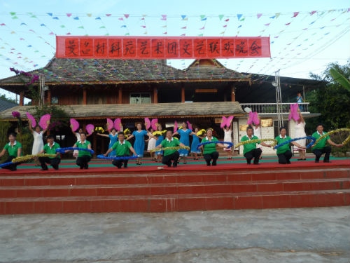 太阳落山后,艺术团就和村老年文艺演出队开展了文艺联欢活动。双方共表演了13个节目。曼召老年演出队表演的节目整齐、大气,阵容庞大,每个节目演出人数都有30至40人。科苑艺术团节目丰富多彩,服装鲜艳。两队的演出都赢得村民的阵阵喝彩。