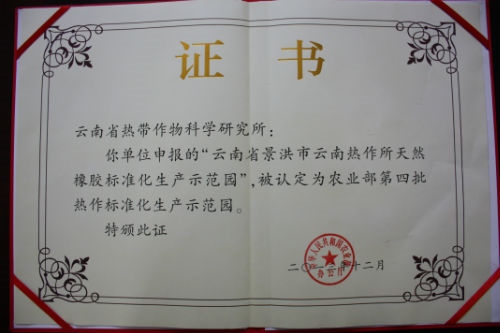 省热作所申报的“云南省景洪市云南热作所天然橡胶标准化生产示范园”,于2013年12月被农业部认定为农业部第四批热作标准化生产示范园。