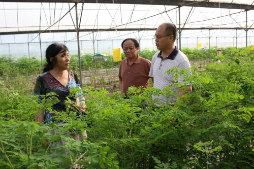 李再山(右一)在辣木试验大棚调研