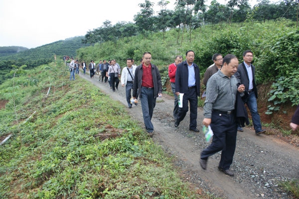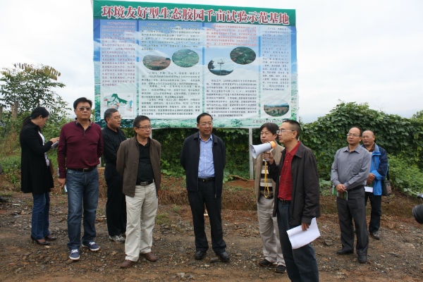 在1000亩生态胶园示范基地,参会人员冒着绵绵秋雨参观生态胶园建设情况,省热作所副所长陈克难从以下几方面介绍了生态胶园的建设情况: