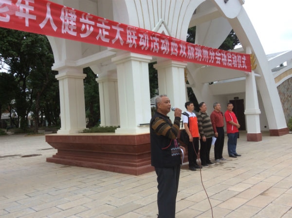 州直老体协主席波追主持启动仪式,州老体协副主席简短讲话,简要宣传了2013年开始的 11月11日 全国老年人健步走大联动活动是全国性的大型老年体育活动,今年正式转入制度化、常态化,其活动主题为:摆动双臂、迈开双腿、走出家门、融入自然、走出健康、走出幸福。要求各级老体协会,广泛发动老年人踊跃参与。