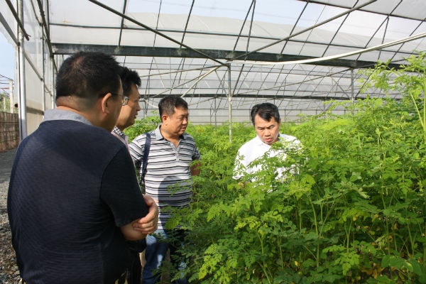 广东省农垦总局党组书记、局长雷勇健(右一)在辣木无土栽培试验大棚调研