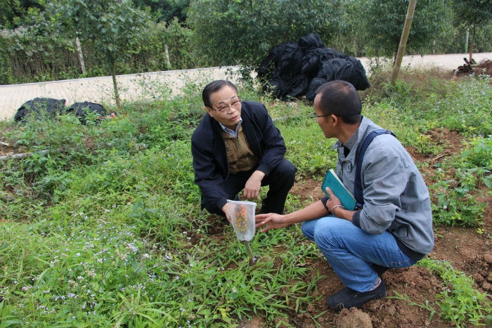 天然橡胶协会秘书长郑文荣(左二)在生态胶园调研