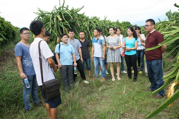 9月8日 ,省热作所所长助理、团委书记李海泉、团委副书记于静娟带领2015年新招聘人员到牛肝菌工厂化栽培基地、云垦澳洲坚果公司、农业部橡胶树优良品种籽苗繁殖基地、中古辣木科技合作中心试验示范基地、火龙果基地、红掌大棚等科研试验示范基地参观。
