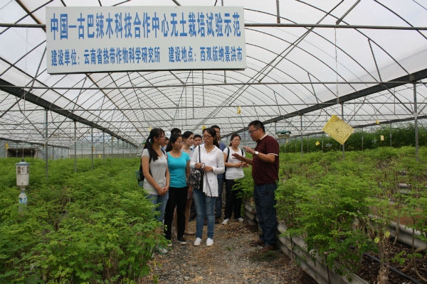 在牛肝菌工厂化栽培基地,农艺师何明霞介绍了从材料准备、拌料、装袋、灭菌、冷却、接种、培养、覆土、出菇培养到采菇销售的整个牛肝菌生产环节。在云垦澳洲坚果公司,副总经理彭志东介绍了澳洲坚果的生产流程、加工技术、产品种类、市场销售等内容。在农业部橡胶树优良品种籽苗繁殖基地所长助理李海泉介绍了橡胶籽苗芽接的三大优点:一是提高了土地资源利用效率,节约了育苗生产成本;二是缩短了生产周期,提高了育苗生产力,产值高;三是保护了橡胶籽苗根系的完整性,定植后能起到防风固土的作用,使树苗能更好的生长。在中古辣木科技合作中心试验示范基地,所长助理、辣木中心主任李海泉从以下几方面介绍了辣木的科研工作情况:一是辣木对外技术交流与合作情况,省热作所以中古辣木科技合作中心为主线,不断加强与国内外辣木研究机构的交流合作;二是辣木品种的收集保存情况,省热作所现已收集保存辣木1品种4个种,种质资源80余份,为辣木新品种的培育奠定了良好基础;三是新品种培育情况,辣木、诺丽种子于2013年搭载“神舟十号”飞船进入太空育种领域;四是在栽培技术上,经过辣木课题组多年的潜心研究、不断创新,现已制定出辣木无土栽培技术规程和辣木露地无公害栽培技术规程两套栽培技术体系,为辣木在云南热区的推广种植提供了技术支撑。同时,所长助理李海泉还介绍了间作在辣木试验区的功能植物诺丽,诺丽富含多种营养元素,具有良好的抗菌、消炎效果,能增强人体免疫力,是人体的保健佳品。在火龙果试验示范基地,高级农艺师赵志平介绍了火龙果的栽培技术、病虫害防治技术、火龙果的市场价值等内容;在红掌大棚,专业技术人员介绍了我所培育并取得知识产权保护的红掌新品种、栽培技术、新品种培育技术、新品种专利申请、市场前景及发展现状等内容。