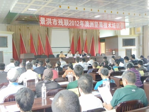 应景洪市残联邀请, 10月19日 我所栽培研究室主任贺熙勇副研究员在勐养农场为景洪市农村残疾人做澳洲坚果栽培技术培训,来自景洪市16个乡镇及农场管委会的代表共110余人参加了培训。