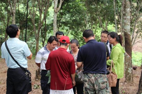 最后,热作所专技人员与胶农及工作人员进行了交流,对胶农提出的问题做了详细耐心的回答。许多胶农认为对橡胶树季风性落叶病认识不足、经常错失防治的最好机会。省热作所专技人员提出防治建议:一是加强监测,提前预防。由于高湿天气,尤其是低温阴雨天气是发病的主要条件,因此在雨季来临之际,加强监测,如发现有染病情况尽早喷药防治,避免扩大危害;二是正确处理管养割关系。如加强林段抚育管理,雨季安全割胶等;三是以农业防治为主,结合化学防治。疫病化学防治主要是喷施内吸性杀菌剂,常用农药有:甲霜灵、乙磷铝、霜脲氰等;四是对发现季风性落叶3级以上的胶树采取立即停割,用5%的霉疫净水济涂施割面,3到5天涂施一次,至病情解除。