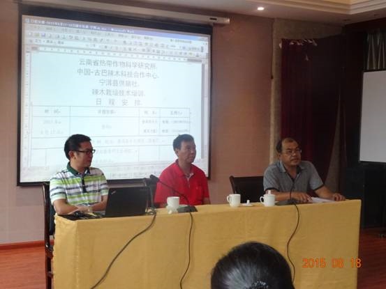 为促进宁洱地区辣木产业健康发展、科学规划、规范种植,并提高辣木栽培技术和病虫害防治技术,8月18日至19日,中-古辣木科技合作中心、云南省热带作物科学研究所在宁洱供销社社有资产经营管理有限公司的协助下,在宁洱地区举办“辣木栽培技术培训班”,培训会由省热作所所长助理、辣木中心主任李海泉主持。