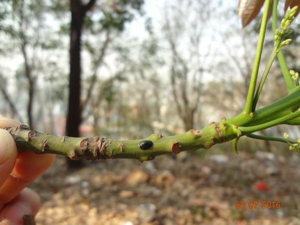 图为橡胶盔蚧为害枝条