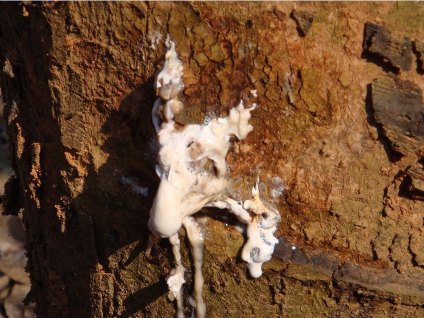 割面与树干爆胶。割面受害后,在割面和茎干各部位常出现爆胶点。从爆胶点刮开树皮,其周围大片树皮皮层褐色,或有黑点、黑斑,树皮渐渐枯死,皮层与木质间内凝胶形成块状胶垫,树皮与木质部分离,并有腐臭味,导致树皮失水干枯。