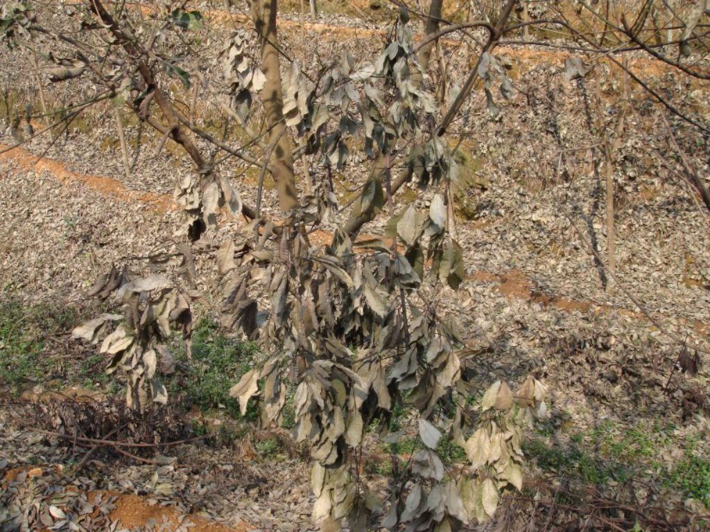 茎干干枯。在受害初期不易发现,用刀刺还有胶流出,刮去表皮,在表皮上可见很多黑色斑块,但皮层和形成层均变成褐色或略发黑色,有酒味。到后期,树皮坏死,但不干缩,刀刺不流胶,挖开树皮常可见一层薄胶膜,随后树皮干裂。一般幼树受害后症状出现较快,成龄树较慢。橡胶树发生寒害时通常伴有小蠹虫为害,甚至整株干枯死亡。